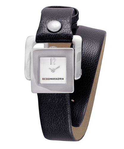 Dress watch, Japanese quartz movement, Polished black hands, Applied polished black Arabic twelve, Silver dial, Black pebble-grain genuine leather double-wrap strap with polished silver-tone stainless steel buckle, Polished silver-tone stainless steel square case, Textured steel crown with logo above twelve o'clock, Stainless steel caseback, Water resistant